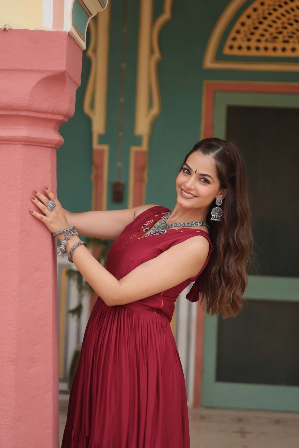 Step into Navratri with elegance in this stunning Reyon gown featuring layered frills, a flattering V-neck design, and a grand 12-meter flair. Perfect for festive garba nights and cultural celebrations.