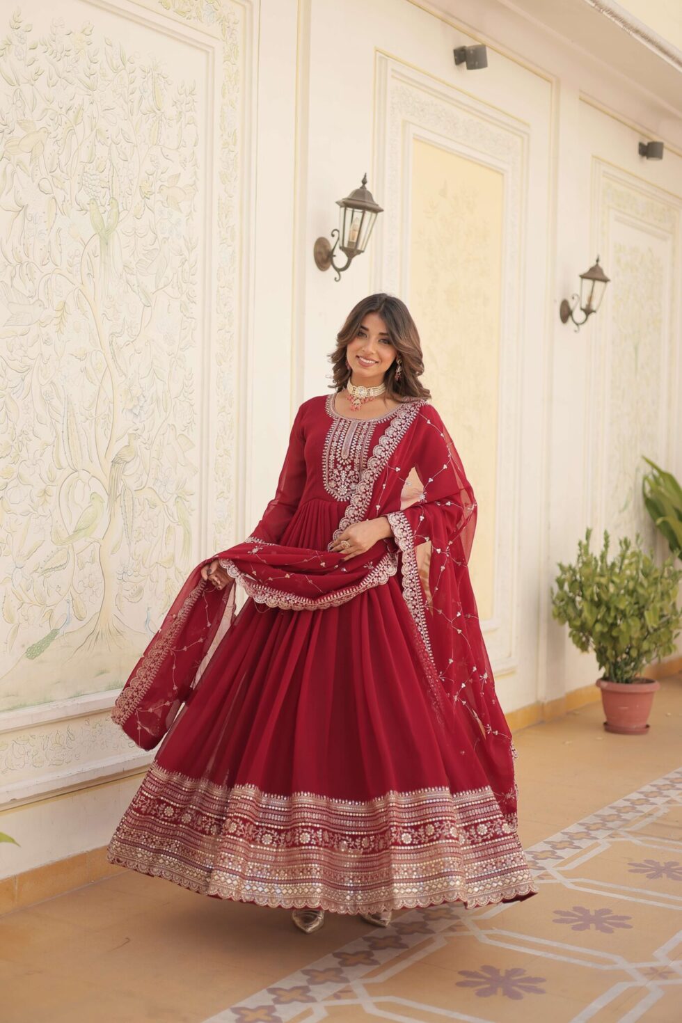 Celebrate every occasion in style with this fully flared Faux Georgette gown featuring intricate sequins embroidery and a designer V-neck. Paired with a matching dupatta adorned with rich sequins embroidery, this festive-ready set is perfect for weddings, parties, and special events.