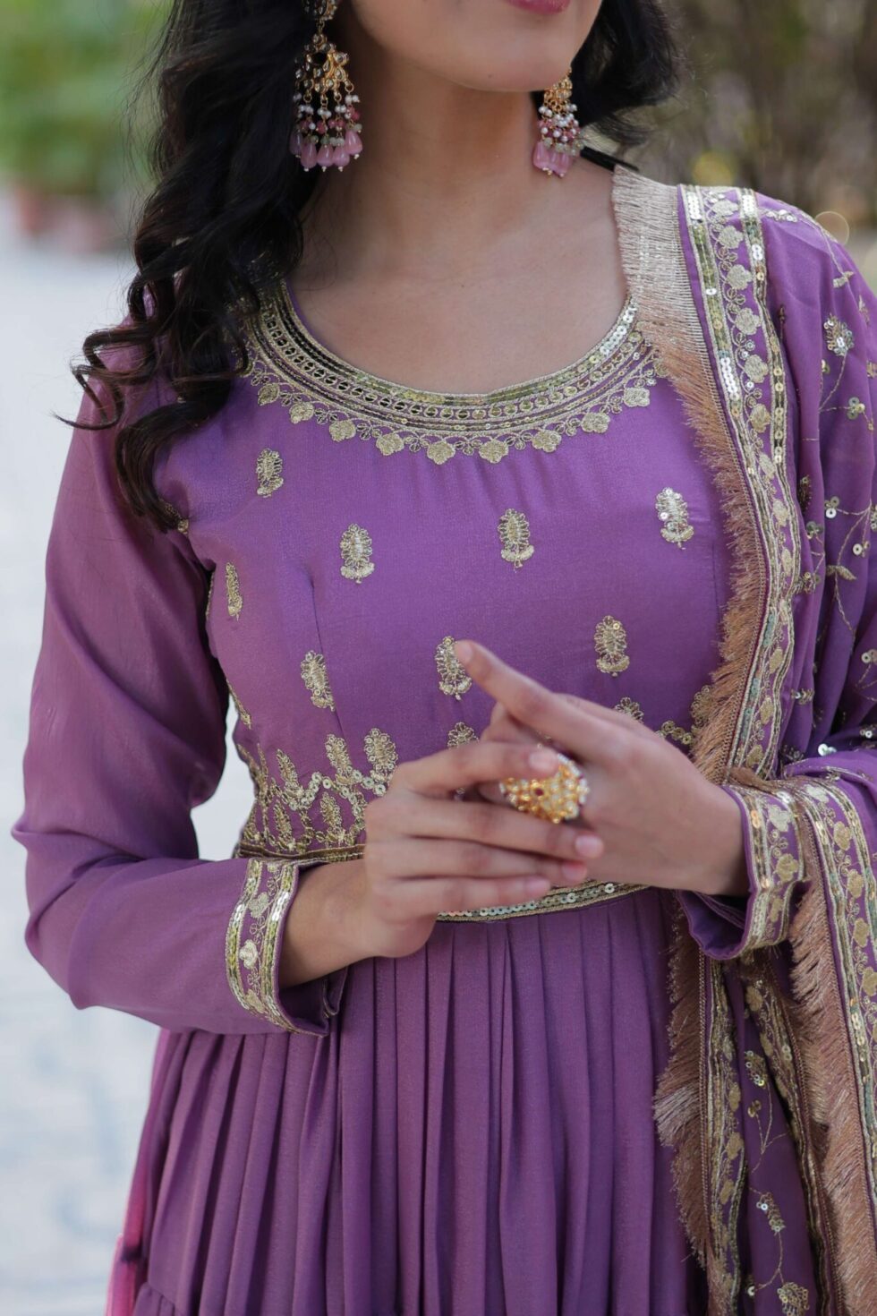 Onion Star Georgette Fully Flared Gown with Sequins Embroidered Dupatta & Lace Border