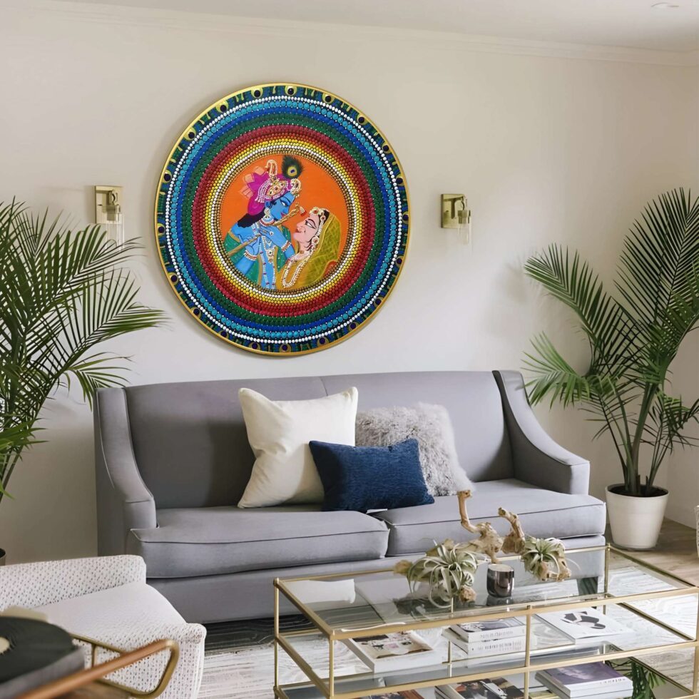 This captivating wall painting seamlessly blends traditional artistry with contemporary design, making it a perfect addition to any modern living space. Crafted with meticulous attention to detail, it features intricate patterns and vibrant colors that evoke a sense of harmony and cultural richness. Ideal for enhancing the ambiance of your home or office, this artwork serves as a testament to timeless craftsmanship and artistic expression.